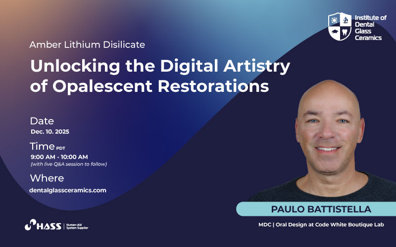 Join world-renowned master dental ceramist Paulo Battistella and Sal Rodas, MBA, President of HASS Bio America, in this dynamic webinar course that dives deep into the transformative capabilities of Amber, a cutting-edge lithium disilicate ceramic.